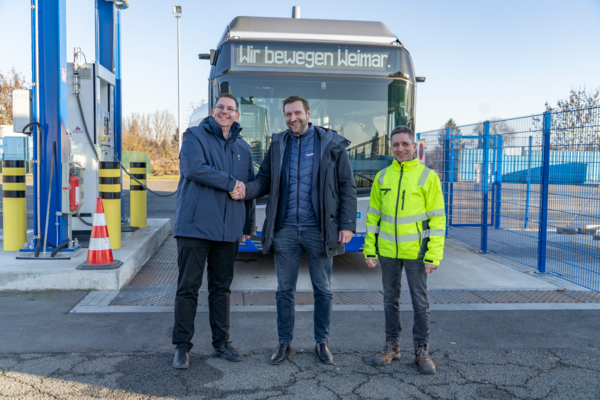 Das Foto wurde durch Bianca Rösnick, Stadtwirtschaft Weimar GmbH, erstellt und zeigt v.l.n.r.: Bernd Wagner, Geschäftsführer Stadtwirtschaft Weimar GmbH; Thomas Zorn, Geschäftsführer Tyczka Hydrogen GmbH; Silvio Brückner, Bereichsleiter Werkstatt Stadtwirtschaft Weimar GmbH.